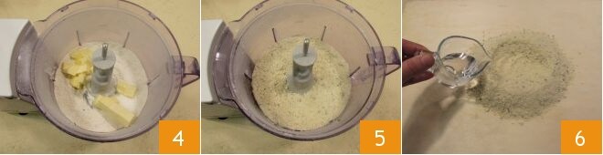 Schalten Sie die Klingen ein, dann fügen Sie die kalte, in Stücke geschnittene Butter aus dem Kühlschrank hinzu 4. Mixen Sie alles, bis eine sandige und mehlige Konsistenz erreicht ist 5. Legen Sie die Mischung auf eine Arbeitsfläche und formen Sie in der Mitte die klassische Brunnenform. Fügen Sie das Eiswasser nach und nach hinzu 6