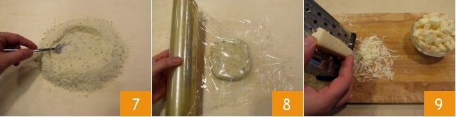 und beginnen Sie mit einer Gabel, den Teig zu sammeln 7; kneten Sie alle Zutaten sehr schnell mit den Händen, um einen kompakten und glatten Teig zu erhalten; formen Sie dann einen Laib, drücken Sie ihn leicht flach und lassen Sie ihn mindestens 20-30 Minuten im Kühlschrank ruhen, eingewickelt in Frischhaltefolie 8. Widmen Sie sich nun der Füllung: Reiben Sie 60 g Käse grob und schneiden Sie den Rest in Würfel von 3-4 mm Größe und legen Sie sie beiseite 9.