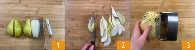 Um den herzhaften Birnen-Gorgonzola-Kuchen zuzubereiten, schneiden Sie zuerst die Birnen in Viertel 1, entfernen Sie das Kerngehäuse und schneiden Sie dünne Scheiben 2 von etwa 2-3 mm Dicke. Reiben Sie die Fontina 3, hacken Sie die Haselnüsse grob und halten Sie sie bereit.