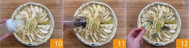 Beträufeln Sie mit Öl 10, fügen Sie eine Prise Pfeffer hinzu 11 und einige Salbeiblätter 12.