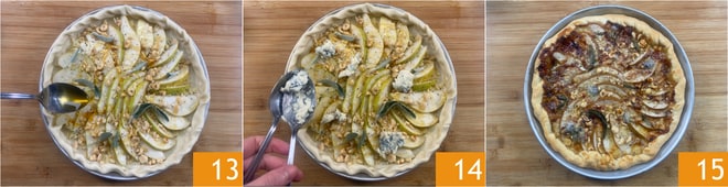 Vervollständigen Sie mit Kastanienhonig 13 und noch etwas Gorgonzola 14. Backen Sie im statischen Ofen, auf mittlerer Schiene, bei 200°C für 30 Minuten, bis zur Goldbräune. Lassen Sie den Kuchen abkühlen und Ihr herzhafter Birnen-Gorgonzola-Kuchen ist bereit zum Genießen 15.