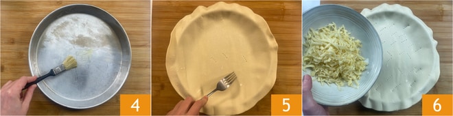Fetten Sie eine runde Springform mit 26 cm Durchmesser ein 4. Legen Sie sie mit dem Blätterteig aus und stechen Sie den Boden mit einer Gabel ein 5. Decken Sie den Boden mit der Fontina ab 6.