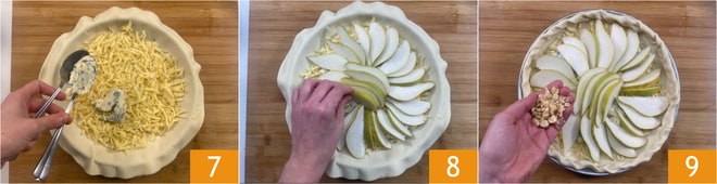 Fügen Sie 5-6 Löffel Gorgonzola hinzu 7, dann legen Sie die Birnenscheiben strahlenförmig an und schließen auch die Mitte 8. Rollen Sie den Rand zu einer Kordel auf. Verteilen Sie die gehackten Haselnüsse auf der Oberfläche 9.