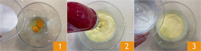 Um den Kuchen ohne Backpulver zuzubereiten, schlagen Sie zuerst die Eier in eine Schüssel, fügen Sie den Zucker hinzu 1 und schlagen Sie mit einem Mixer 2. Geben Sie den Joghurt dazu, möglichst bei Zimmertemperatur 3.
