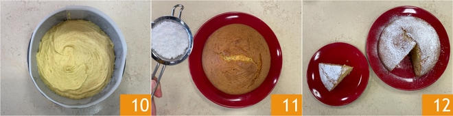 Glätten Sie den Teig 10 und backen Sie ihn im statischen Ofen bei 170°C für 30-35 Minuten. Lassen Sie ihn abkühlen, stürzen Sie ihn aus der Form und dekorieren Sie ihn mit Puderzucker 11. Ihr Kuchen ohne Backpulver ist bereit zum Genießen 12!