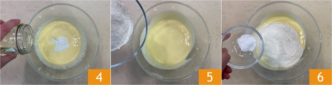 Fahren Sie fort mit dem Pflanzenöl 4, dem Mehl 5 und dem Natron 6.
