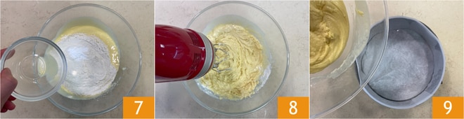 Zum Schluss fügen Sie den weißen Weinessig hinzu 7. Arbeiten Sie mit dem Mixer 8, bis Sie einen homogenen Teig erhalten. Gießen Sie den Teig in eine 20 cm große Form 9, die mit Backpapier ausgelegt ist.