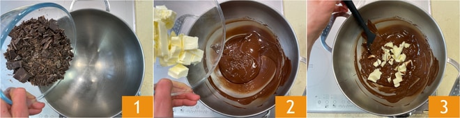 Um den Himbeer-Tenerina-Kuchen zuzubereiten, schmelzen Sie zunächst die Schokolade im Wasserbad 1. Fügen Sie die in Stücke geschnittene gesalzene Butter hinzu 2 und lassen Sie sie vollständig schmelzen 3.