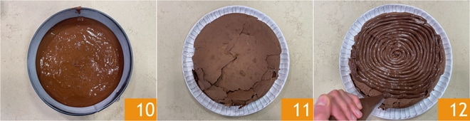 Fetten und mehlen Sie eine Springform mit einem Durchmesser von 25 cm, gießen Sie die Masse hinein und glätten Sie sie 10. Backen Sie im statischen Ofen bei 180°C für 25-30 Minuten. Nehmen Sie den Kuchen aus dem Ofen 11 und lassen Sie ihn abkühlen. Übertragen Sie den Kuchen auf eine Platte und dekorieren Sie ihn mit Haselnusscreme 12.