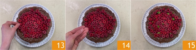 Fahren Sie fort mit den Himbeeren 13, Maldon-Salz 14 und einigen Minzblättern. Ihr Himbeer-Tenerina-Kuchen ist bereit, serviert zu werden 15.