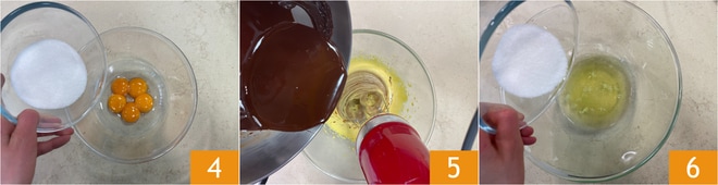 Trennen Sie die Eigelbe von den Eiweißen und geben Sie sie in zwei Schüsseln. Fügen Sie die Hälfte des Zuckers 4 zu den Eigelben hinzu und schlagen Sie sie mit einem elektrischen Mixer, bis eine schaumige Masse entsteht. Gießen Sie die geschmolzene Schokolade in einem dünnen Strahl dazu, während Sie weiter mit dem Mixer arbeiten 5. Fügen Sie den restlichen Zucker zu den Eiweißen hinzu 6.