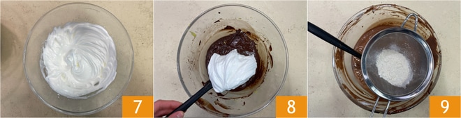 Schlagen Sie die Eiweiße steif, mit sauberen und trockenen Schneebesen 7. Fügen Sie die Eiweiße der Schokoladenmasse hinzu 8 und heben Sie sie mit Bewegungen von oben nach unten unter, um die Eiweiße nicht zu entlüften. Fügen Sie das gesiebte Mehl hinzu 9 und mischen Sie vorsichtig, ebenfalls mit Bewegungen von oben nach unten.