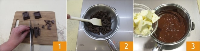 Um die Torta Tenerina zuzubereiten, beginnen Sie damit, die Schokolade fein zu hacken 1. Dann geben Sie sie in eine Schüssel, die in einem Topf mit Wasser steht (möglichst sollte das Wasser nicht mit dem Boden der Schüssel oder des kleinen Topfes, in den Sie die Schokolade gegeben haben, in Berührung kommen) und schmelzen Sie sie im Wasserbad, dabei ständig rühren 2. Erst wenn die Schokolade geschmolzen, aber nicht zu heiß ist, fügen Sie die in Stücke geschnittene Butter hinzu 3.