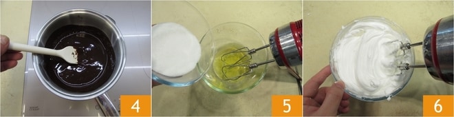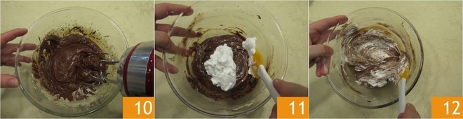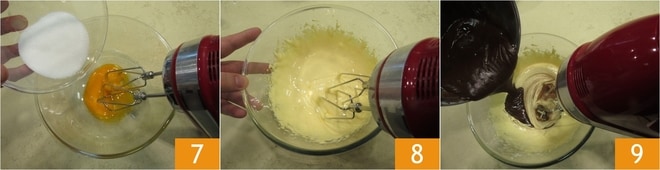 Stellen Sie die steif geschlagenen Eiweiße beiseite und geben Sie den restlichen Zucker in die Eigelbe 7, dann schlagen Sie alles bei mäßiger Geschwindigkeit, bis eine helle und schaumige Masse entsteht 8. An diesem Punkt, während die Rührbesen noch laufen, fügen Sie die abgekühlte Schokoladen-Butter-Mischung in einem dünnen Strahl hinzu 9.