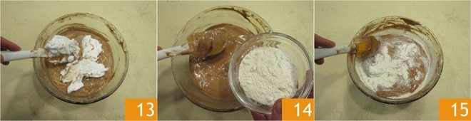 Geben Sie dann die restlichen Eiweiße hinzu, diesmal vorsichtig von unten nach oben rühren 13. Fügen Sie das vorher gesiebte Mehl hinzu 14 und rühren Sie immer mit einem Spatel vorsichtig von unten nach oben 15.