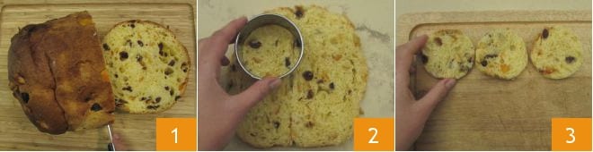 Um die Törtchen aus Panettone und Nutella® zuzubereiten, schneiden Sie zuerst den Panettone in 1 cm dicke Scheiben 1. Aus den Scheiben 12 Scheiben mit einem 6 cm großen Ausstecher ausstechen (2-3).