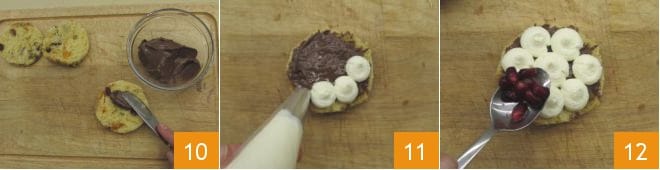 Nun nehmen Sie jede Panettone-Scheibe und füllen sie mit Nutella® 10. Spritzen Sie darauf einige Cremetupfen 11, sodass die Oberfläche vollständig bedeckt ist. Fügen Sie einige Granatapfelkerne hinzu 12