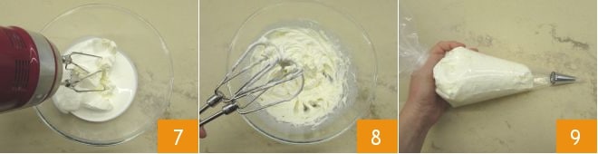 Mit den elektrischen Rührbesen 7 aufschlagen, bis eine feste und schaumige Creme entsteht 8, und in einen Spritzbeutel mit glatter Tülle füllen 9.