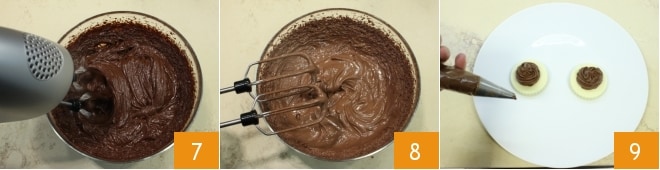 Sobald die Creme gut gekühlt ist, schlagt die Mischung mit einem elektrischen Handrührgerät 7, bis sie cremig und dick wird 8 (das dauert mindestens 10 Minuten). Jetzt, da eure Ganache-Creme fertig ist, füllt sie in einen Spritzbeutel mit Sterntülle und verziert die Oberfläche der Törtchen mit weißer Schokolade mit einem Cremetupfen 9.