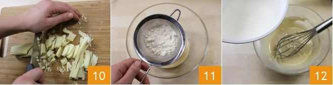 Jetzt widmet euch der hellen Creme, klickt hier, um das Rezept der Weiße-Schokoladen-Puddingcreme anzusehen: schneidet die weiße Schokolade mit einem Messer in Späne 10 und stellt sie beiseite, gebt in eine Schüssel die Kondensmilch und fügt das gesiebte Mehl hinzu 11. Erwärmt die Milch bei niedriger Hitze in einem kleinen Topf, dann gebt sie nach und nach zu der Mehl- und Kondensmilchmischung, wobei ihr mit einem Schneebesen rührt, um Klumpenbildung zu vermeiden 12.