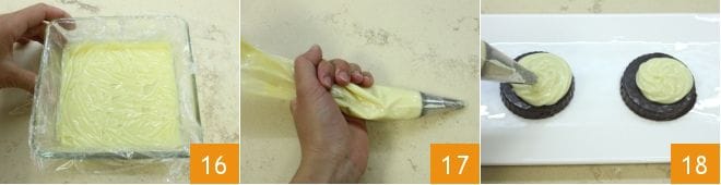 deckt sie mit Frischhaltefolie ab 16 und lasst sie, sobald sie Zimmertemperatur erreicht hat, im Kühlschrank abkühlen. Nehmt die kalte Creme und füllt sie in einen Spritzbeutel mit Sterntülle 17, garniert die Oberfläche der Törtchen mit Zartbitterschokolade 18, wie ihr es zuvor gemacht habt. Eure Törtchen mit Creme aus zwei Schokoladen sind fertig, garniert sie mit Schokoladenspänen und genießt sie!