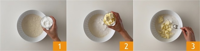 Um die Creme-Törtchen zuzubereiten, beginnen Sie mit dem Mürbeteig: Geben Sie das Mehl, den Zucker 1, eine Prise Salz und die in Stücke geschnittene Butter bei Raumtemperatur 2 in eine Schüssel. Fügen Sie auch das Backpulver hinzu 3.