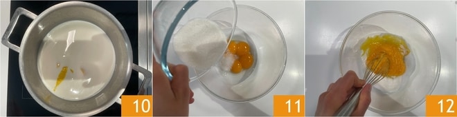 Bringen Sie die Milch fast zum Kochen 10. In der Zwischenzeit geben Sie die Eigelbe zusammen mit dem Zucker 11 in eine Schüssel und rühren das Gemisch mit einem Schneebesen 12.