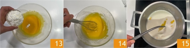 Fügen Sie auch die Maisstärke hinzu 13 und integrieren Sie sie mit dem Schneebesen, bis ein homogenes, klumpenfreies Gemisch entsteht 14. Sobald die Milch zu kochen beginnt, entfernen Sie die Zitronenschale 15.