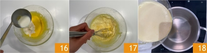 Gießen Sie die heiße Milch langsam in die Eigelbmischung 16, während Sie kontinuierlich rühren 17. Übertragen Sie das Gemisch erneut in den Topf und stellen Sie die Hitze auf niedrig 18.