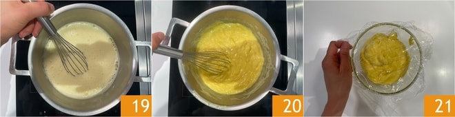 Kochen Sie bei schwacher Hitze unter ständigem Rühren 19, bis die Creme eindickt 20. Übertragen Sie sie in eine Schüssel, bedecken Sie sie mit Frischhaltefolie und lassen Sie sie zuerst auf Raumtemperatur und dann im Kühlschrank abkühlen 21.