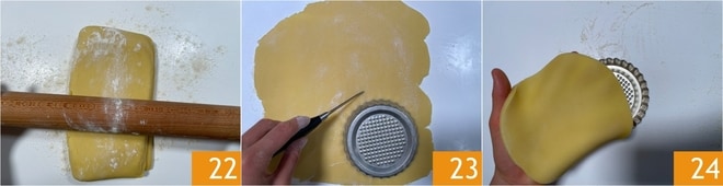 Nach der Ruhezeit rollen Sie den Mürbeteig mit einem Nudelholz auf eine Dicke von ca. 3-5 mm aus, bestäuben Sie die Arbeitsfläche mit etwas Mehl 22. Nehmen Sie Törtchenformen von 10-12 cm und schneiden Sie Mürbeteigscheiben aus, die etwas größer sind als der Durchmesser 23, um sowohl den Boden als auch die Ränder gut zu bedecken 24.