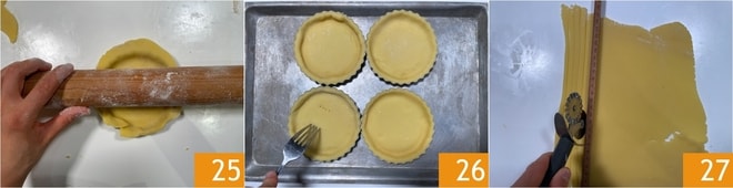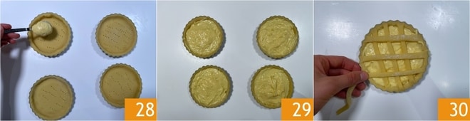 Drücken Sie den Mürbeteig gut in die Form, dann rollen Sie mit dem Nudelholz über den Rand, um den überschüssigen Teig zu entfernen 25. Stechen Sie den Boden mit einer Gabel ein 26. Rollen Sie nun den restlichen Mürbeteig erneut aus, wieder auf eine Dicke von 3-5 mm, und schneiden Sie mit einem Rädchen dünne Streifen von etwa 5 mm Breite aus, um die Gitter zu machen 27. Wenn die Förmchen antihaftbeschichtet sind, ist es nicht nötig, sie zu buttern.