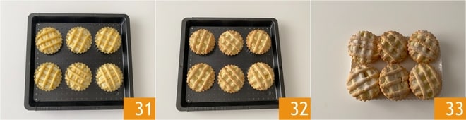 Stellen Sie die Törtchen auf ein Backblech 31 und backen Sie sie im vorgeheizten statischen Ofen bei 180° etwa 35 Minuten lang. Wenn sie gut gebräunt sind, nehmen Sie sie aus dem Ofen 32 und lassen Sie sie abkühlen. Dann entfernen Sie sie aus der Form. Schließlich mit Puderzucker bestäuben. Ihre Creme-Törtchen sind bereit, genossen zu werden 33!