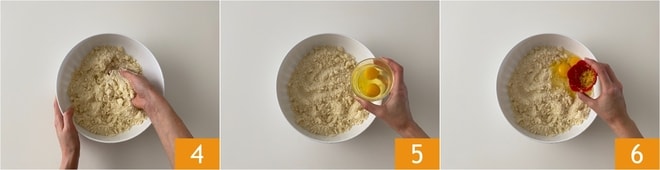 Kneten Sie den Teig mit den Händen, bis ein sandiges Gemisch entsteht 4. Geben Sie an diesem Punkt die Eier hinzu 5 und aromatisieren Sie mit der abgeriebenen Schale einer Zitrone 6.