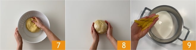 Kneten Sie von Hand, bis ein kompakter und homogener Teig entsteht 7. Wickeln Sie den Mürbeteig in Frischhaltefolie 8 und legen Sie ihn für 15-20 Minuten in den Kühlschrank. Bereiten Sie in der Zwischenzeit die Creme Pasticcera zu: Gießen Sie die Milch in einen Topf mit der Zitronenschale 9.