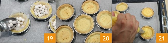 Stechen Sie den Boden der Törtchen mit einer Gabel ein. Schneiden Sie aus einem Blatt Backpapier Quadrate in der Größe der Törtchen aus und bedecken Sie den Boden, um dann getrocknete Bohnen oder Porzellankugeln hineinzugeben 19. Backen Sie im Ofen bei 165°C für 30 Minuten. Entfernen Sie die getrockneten Hülsenfrüchte und das Papier 20 und stellen Sie es für weitere 10 Minuten bei 170°C in den Ofen, um das Innere zu färben. Lassen Sie abkühlen, füllen Sie einen Spritzbeutel mit Lemon Curd und füllen Sie die Törtchen 21.