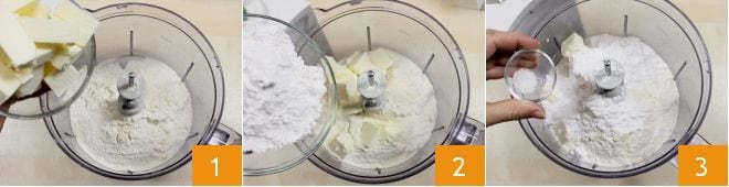 Um die Törtchen mit Pfirsichen und Creme zuzubereiten, beginnen Sie mit dem Mürbeteig (das detaillierte Verfahren finden Sie Mürbeteig): Geben Sie in eine Küchenmaschine das Mehl, die kalte Butter in Stücken 1, den Puderzucker 2 und das Salz 3.