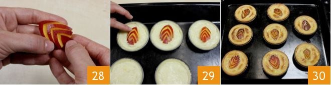Drücken Sie nun vorsichtig mit den Fingern die Pfirsichstücke nach unten 28; Sie sollten eine Ähre geformt haben. Platzieren Sie sie in der Mitte jedes Törtchens 29 und backen Sie sie im vorgeheizten statischen Ofen bei 170 °C für 45-50 Minuten (wenn Umluftofen, dann bei 160 °C für 40-45 Minuten). Nehmen Sie sie aus dem Ofen, wenn die Ränder der Törtchen goldbraun sind 30. Nehmen Sie sie aus der Form und servieren Sie Ihre warmen Törtchen mit Pfirsichen und Creme!