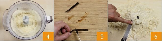 Schalten Sie die Küchenmaschine ein, bis Sie eine sandige Mischung erhalten 4. Übertragen Sie diese auf eine Arbeitsfläche oder eine kalte Arbeitsplatte. Nehmen Sie dann die Hälfte einer Vanilleschote, entnehmen Sie die Samen mit der Spitze eines kleinen Messers 5 und fügen Sie sie der sandigen Mischung hinzu 6.