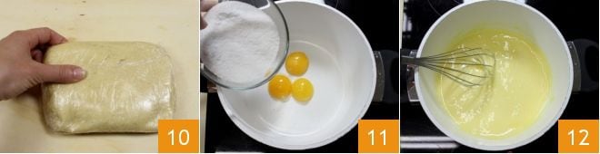 Wickeln Sie ihn in Frischhaltefolie 10 und lassen Sie ihn mindestens eine halbe Stunde im Kühlschrank abkühlen. Bereiten Sie in der Zwischenzeit die Creme zu: Geben Sie in einen großen Topf die Eigelbe und fügen Sie den Zucker hinzu 11, rühren Sie bei sehr niedriger Hitze mit einem Schneebesen, bis der Zucker geschmolzen ist 12.