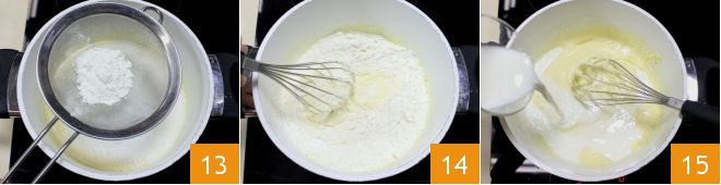 Geben Sie dann die Maisstärke und das Mehl nach und nach hinzu, indem Sie sie sieben 13, und rühren Sie alles weiterhin mit dem Schneebesen, um eine homogene und klumpenfreie Mischung zu erhalten 14. Fügen Sie nun die Milch bei Raumtemperatur 15 und die Sahne hinzu, während Sie immer mit dem Schneebesen rühren.