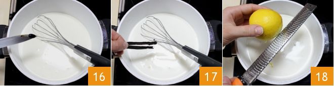 Nehmen Sie die andere Hälfte der Vanilleschote, schneiden Sie sie mit dem Messer ein und entnehmen Sie die Samen, die Sie der Creme hinzufügen 16, dann geben Sie auch die halbierte und geöffnete Schote hinein 17. Zum Schluss reiben Sie direkt in den Topf die Schale der unbehandelten Zitrone 18.