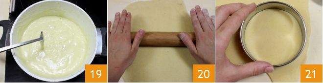 Rühren Sie kontinuierlich mit dem Schneebesen und lassen Sie die Creme bei sehr niedriger Hitze mindestens 15 Minuten kochen oder bis die Creme eine cremige und kompakte Konsistenz erreicht hat wie eine Puddingcreme 19. Dann schalten Sie das Feuer aus, lassen Sie die Creme abkühlen und füllen Sie sie in einen Spritzbeutel. Nehmen Sie nun den Mürbeteig aus dem Kühlschrank und legen Sie ihn auf eine bemehlte Arbeitsfläche oder einen Arbeitsplatz. Rollen Sie ihn mit einem Nudelholz auf eine Dicke von einem halben Zentimeter aus 20 (falls der Mürbeteig dazu neigt, zu brechen, legen Sie ihn zwischen zwei leicht geölte Backpapiere und rollen Sie ihn immer mit dem Nudelholz aus). Dann stechen Sie mit einem Ausstecher 8 Scheiben mit einem Durchmesser von etwa 9-10 cm aus 21.