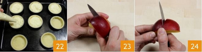 Legen Sie die geschnittenen Scheiben in Förmchen mit einem Durchmesser von 8 cm, die zuvor gebuttert und bemehlt wurden. Füllen Sie jede Form gut mit dem Teig aus und drücken Sie den Boden und die Ränder an. Nehmen Sie den Spritzbeutel mit der Creme und füllen Sie jede Form bis zum Rand 22; dann legen Sie sie in den Kühlschrank, um sie abzukühlen: Auf diese Weise verhindern Sie, dass die Ränder des Teigs während des Backens nach innen fallen. Bereiten Sie inzwischen die Dekoration mit den Pfirsichen vor: Schneiden Sie sie in 4 Spalten 23 und dann in der Breite in zwei Hälften 24.