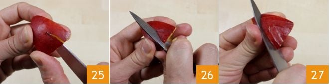 Beginnen Sie an der breiten Basis und machen Sie in der Mitte einen kleinen schrägen Einschnitt, als ob Sie ein umgedrehtes V formen würden (25-26). Lassen Sie ein paar Millimeter Platz und machen Sie weitere Einschnitte, immer in V-Form; wiederholen Sie den Vorgang, bis Sie fast das Ende des Pfirsichviertels erreicht haben 27.