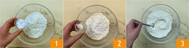 Um die Layer Cake zuzubereiten, bereiten Sie zuerst die 3 Böden vor. Geben Sie das Mehl, das gesiebte Backpulver 1, eine Prise Salz 2 in eine Schüssel und vermischen Sie alles 3.