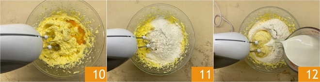 Mischen Sie, bis sie gut eingearbeitet sind 10. Geben Sie das Mehl in 3 Portionen hinzu 11, abwechselnd mit etwas Buttermilch 12. In dieser Phase verwenden Sie den Mixer auf niedriger Geschwindigkeit, um den Teig nicht zu stark zu bearbeiten.