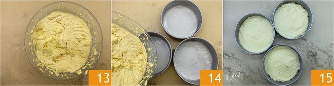Arbeiten Sie weiter auf niedriger Geschwindigkeit, bis Sie eine homogene Mischung erhalten 13. Füllen Sie diese dann in 3 zuvor eingefettete 20-cm-Formen, die am Boden mit Backpapier ausgelegt sind 14. Glätten Sie die Oberfläche gut 15 und backen Sie im vorgeheizten statischen Ofen bei 180° für 25 Minuten.