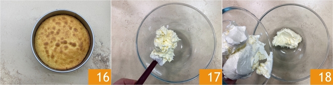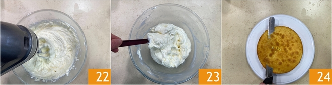 Mischen Sie immer mit dem Handmixer zwischen den Zugaben 22, bis Sie eine glatte und dichte Creme erhalten 23. Sobald die Böden kalt sind, formen Sie sie aus und glätten Sie die Oberseite 24.