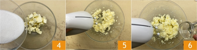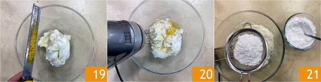 Fügen Sie die abgeriebene Zitronenschale hinzu 19 und mischen Sie mit dem Handmixer für 3 Minuten 20. Fügen Sie den gesiebten Puderzucker in 3 Portionen hinzu 21.